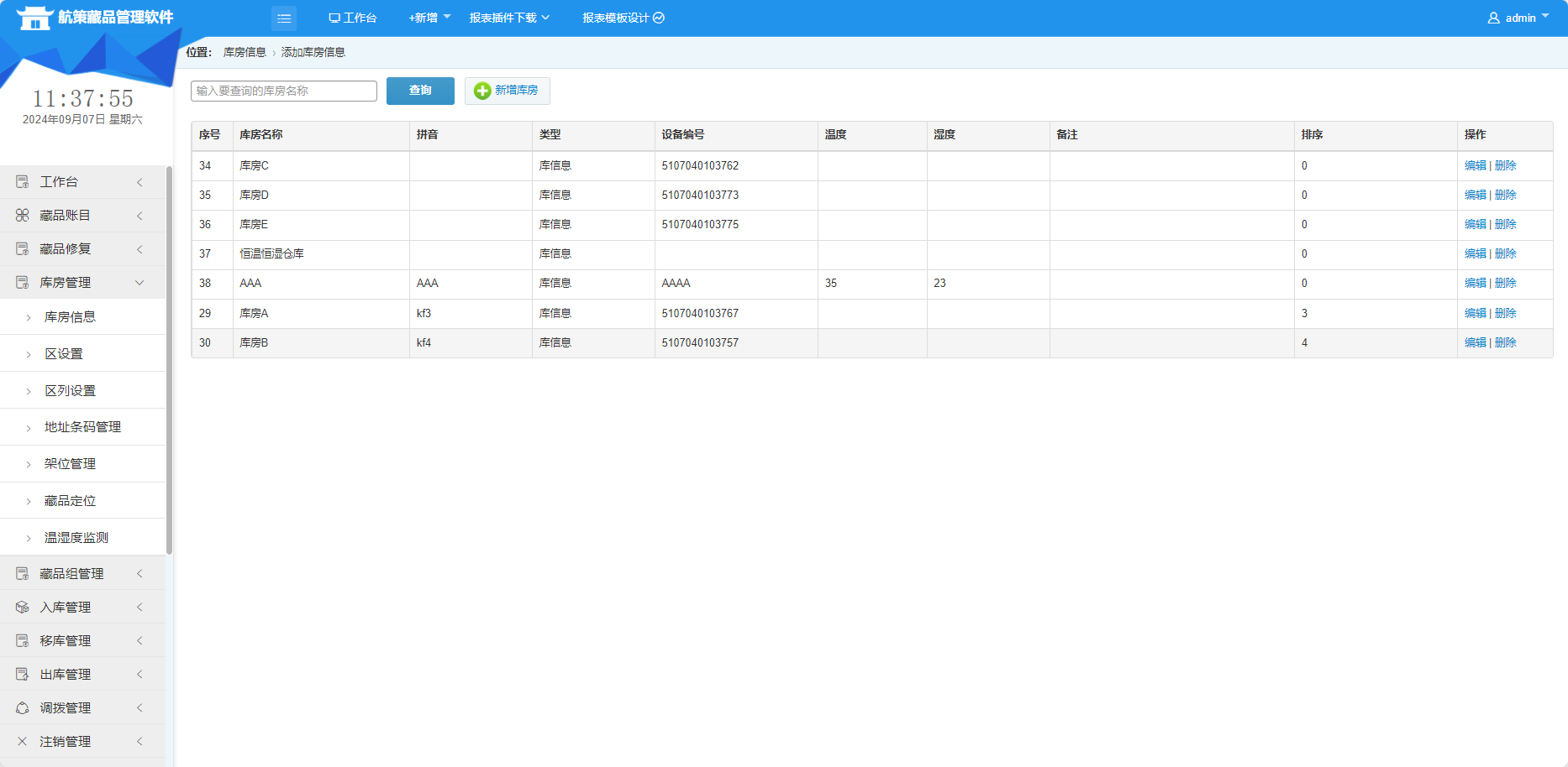 可編輯添加多個庫房,并查看指定庫房中的藏品信息。