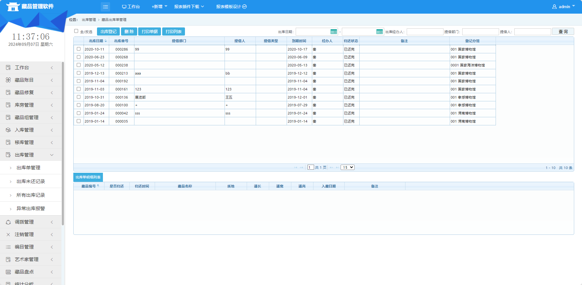 1.藏品出庫選擇出庫的藏品,對其出庫信息、時間及其出庫原由進行記錄,然后向管理員發(fā)送出庫的藏品信息進行審核出庫。